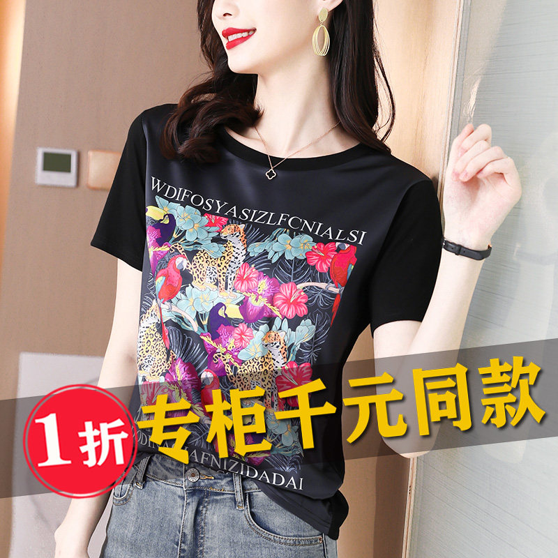 薄款冰丝短袖t恤女夏季宽松圆领印花体恤胖mm真丝上衣设计感半袖热门设计联盟服务商
