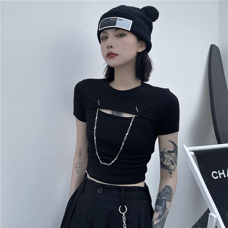 2021个性时尚短款上衣女夏t恤链条镂空别致甜美上衣女夏季设计t恤热门设计联盟服务商