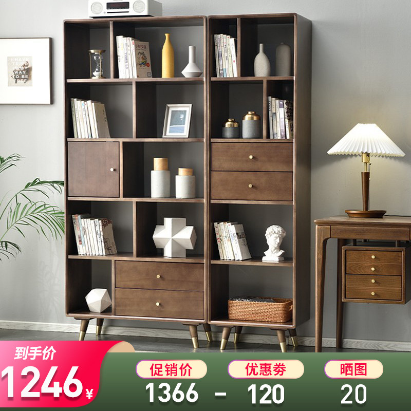 全实木落地书架书柜一体靠墙整墙置物架胡桃轻奢办公室美式新中式热门设计联盟服务商